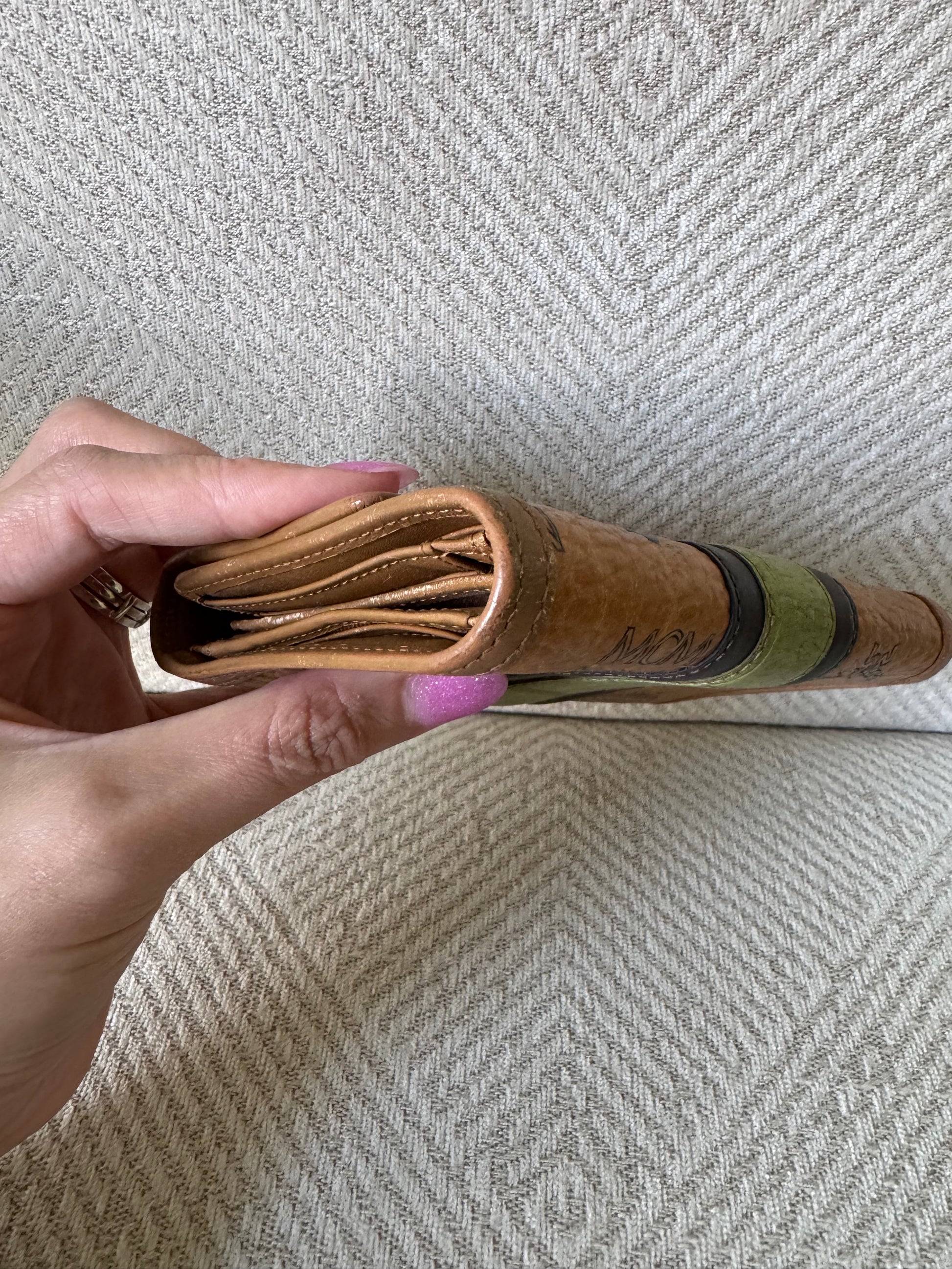 Preloved wallet; some signs of wear but overall in good condition. Cognac and green color.